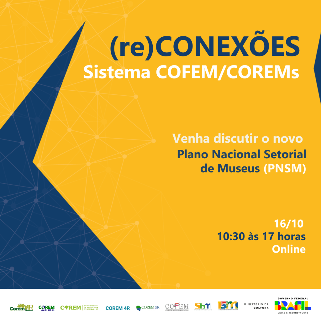 No dia 16 de outubro, o Conselho Federal de Museologia (COFEM) e os Conselhos Regionais de Museologia (COREMs), em parceria com o Instituto Brasileiro de Museus (Ibram), realizarão uma edição on-line do programa (re)CONEXÕES.