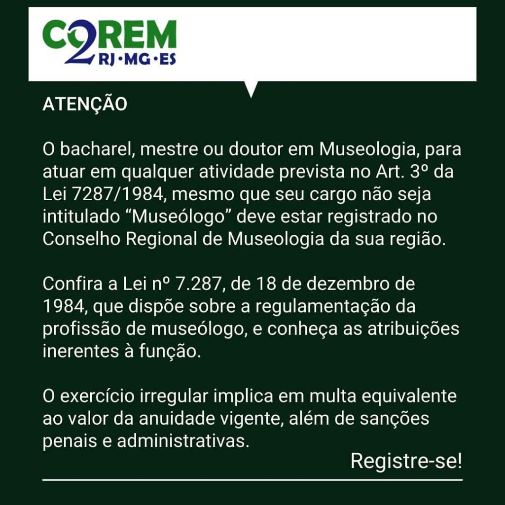 O registro nos Conselhos Regionais de Museologia confere aos Bacharéis, Mestres ou Doutores em Museologia, formados por cursos reconhecidos pelo Ministério da Educação, o título de Museólogo(a). O registro ativo é obrigatório para os profissionais formados em Museologia que estejam desenvolvendo ou venham a desenvolver qualquer atividade prevista no Art.3º da Lei 7.287/1984, mesmo que o cargo ocupado não seja intitulado “Museólogo”.